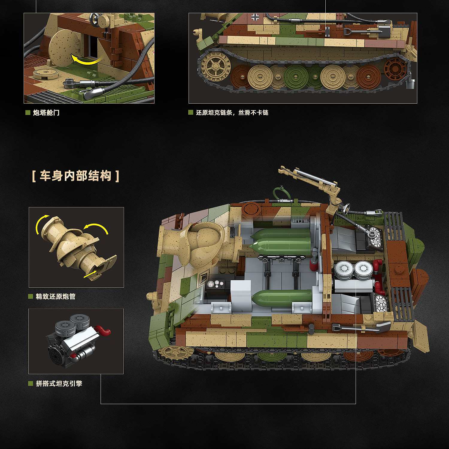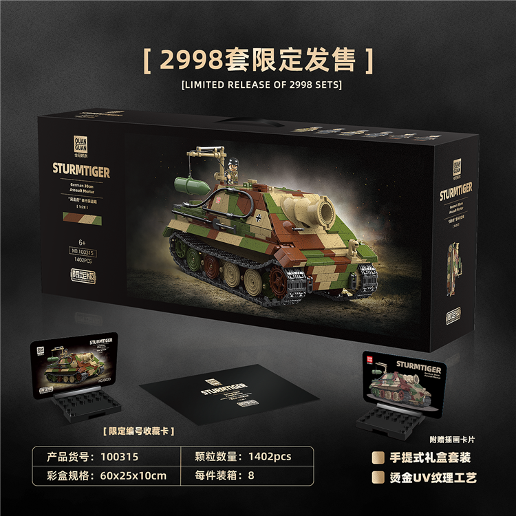 Este set de construccion Sturmpanzer VI forma parte de la coleccion militar de QuanGuan y cuenta con 1402 piezas de alta calidad para una experiencia autentica. Perfecto para coleccionistas y aficionados militares.