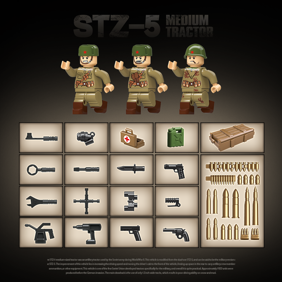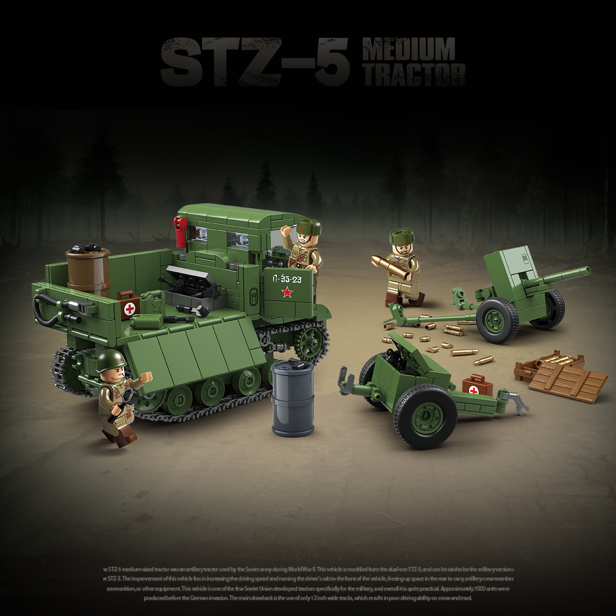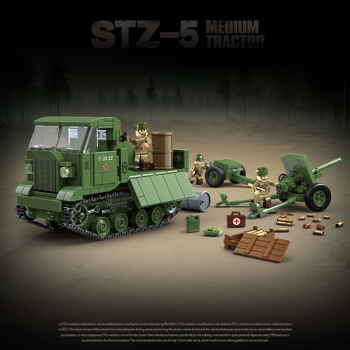 El STZ-5 era un tractor de artillería soviético utilizado para remolcar armas y equipos pesados. Basado en diseños de tractores civiles, fue ampliamente utilizado durante la Segunda Guerra Mundial para apoyo logístico y de artillería.