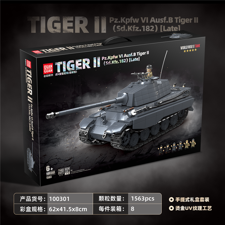 Modelo avanzado Tiger II con modificaciones de finales de la guerra, componentes interiores detallados y calidad de construcción superior.