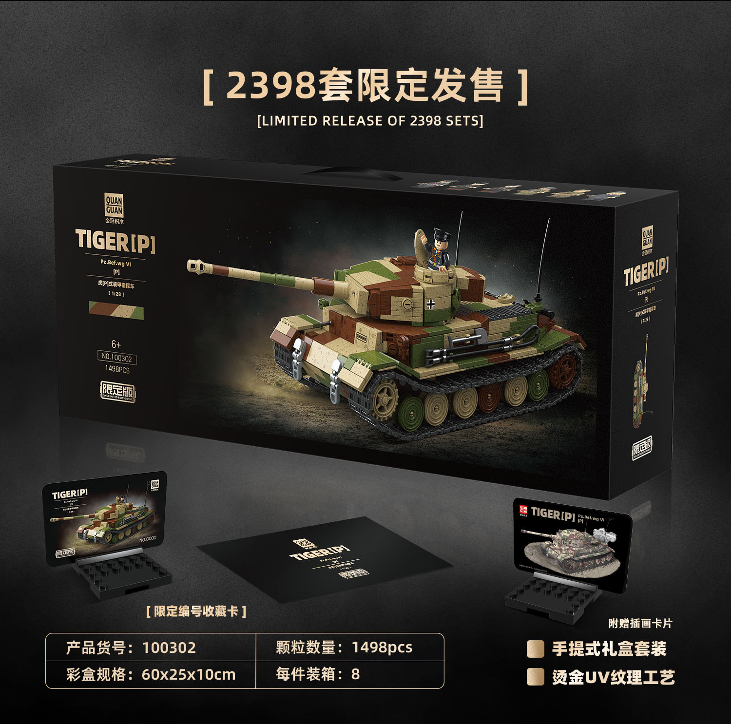 Ce set Tiger (P) Pz.Bef.wg VI (P) fait partie de la collection militaire QuanGuan et comprend 1498 pieces de haute qualite pour une experience de construction authentique. Parfait pour les collectionneurs et passionnes d'histoire militaire.